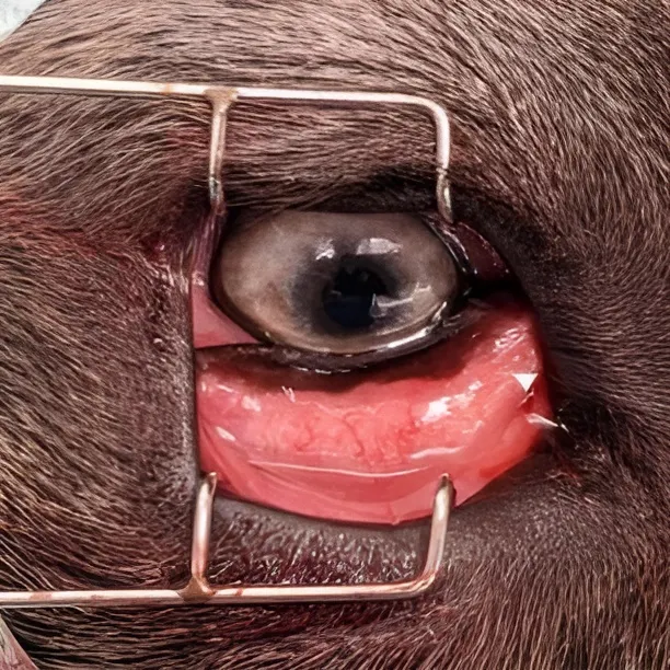 Under general anaesthesia—and with local anaesthetic for extra comfort—we performed a modified Morgan pocket repair. This technique creates a small pocket within the third eyelid to gently tuck the gland back into its normal position while keeping it working. Surgery was performed using fine magnification and delicate sutures. Poppy went home the same day with an Elizabethan collar, a short course of antibiotic eye drops, and anti‑inflammatory pain relief.